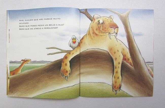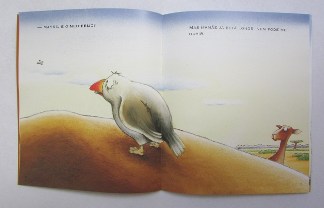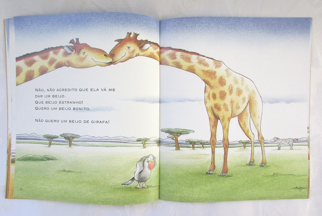 Depois de ter seu beijo esquecido, a pequena ave passa a história inteira tentando encontrar outro animal que possa preencher esse vazio. Ela procura a girafa, a avestruz, um felino e até um rinoceronte, com quem cria um vínculo mais forte.