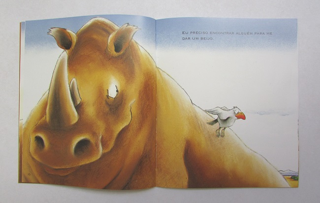 Não posso pedir um beijo ao rinoceronte. A boca dele é grande demais. Se ele me der um beijo, só um pouco vai ficar na minha bochecha. O resto vai se perder no ar. A minha bochecha é pequena para um beijo tão grande. Eu preciso achar outra pessoa.